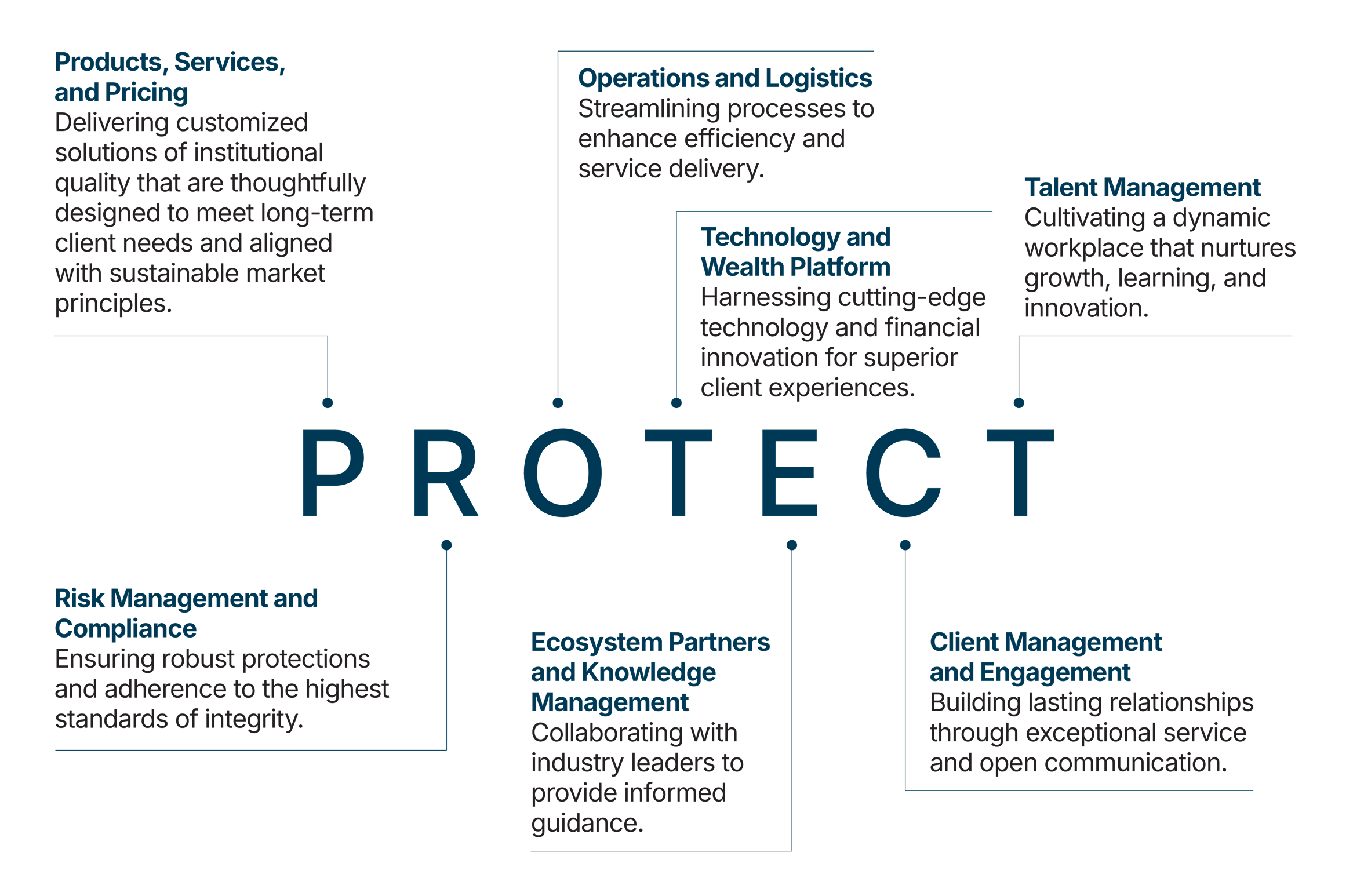 Our mission is to safeguard and grow our clients’ financial capital through our innovative PROTECT strategy. We commit to a relentless pursuit of excellence across the following dimensions: